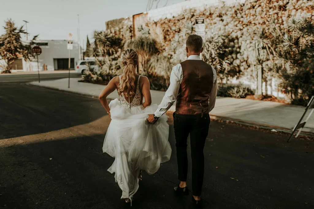 This wedding was goals, and then some! Ashley and Chris have impeccable style, I mean her dress and hair, come on. And having bridesmaids wear all black... that's my kind of style. SmogShoppe is such a beautiful, intimate venue located right on La Cienega Blvd. I couldn't stop thinking about the song Setting the World on Fire, by Kenney Chesney!! So romantic. There's plenty of alleys right outside the venue that made for great bride and groom portraits, and the bounced lighting made for gorgeously lit photo ops.